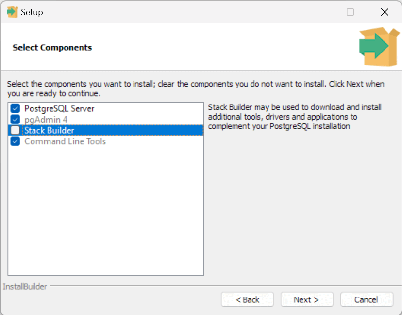 • Stack Builder provides a GUI that allows you to download and install drivers that work with PostgreSQL.