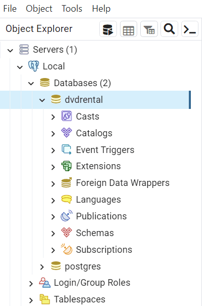 Finally, open the dvdrental database from the object browser panel, you will find tables in the public schema and other database objects as shown in the following picture: