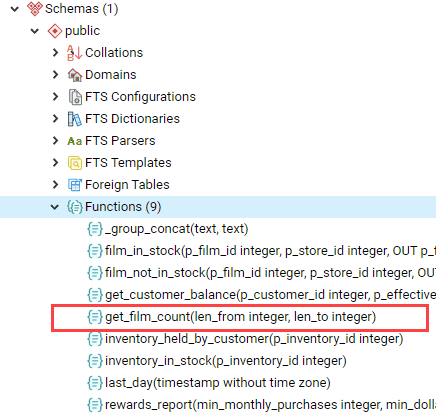 Finally, view the function get_film_count in the Functions list: