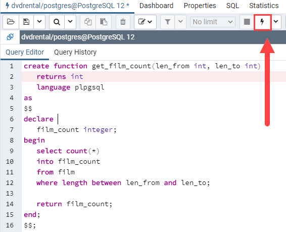 Third, enter the above code in the query tool and click the Execute button to create the get_film_count function.