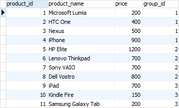 We will use the products table created in the PostgreSQL window function tutorial to demonstrate the functionality of the ROW_NUMBER() function.